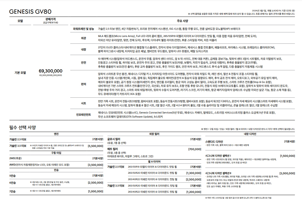 👇제네시스gv80 기본, 필수 선택 사양 가격표👇