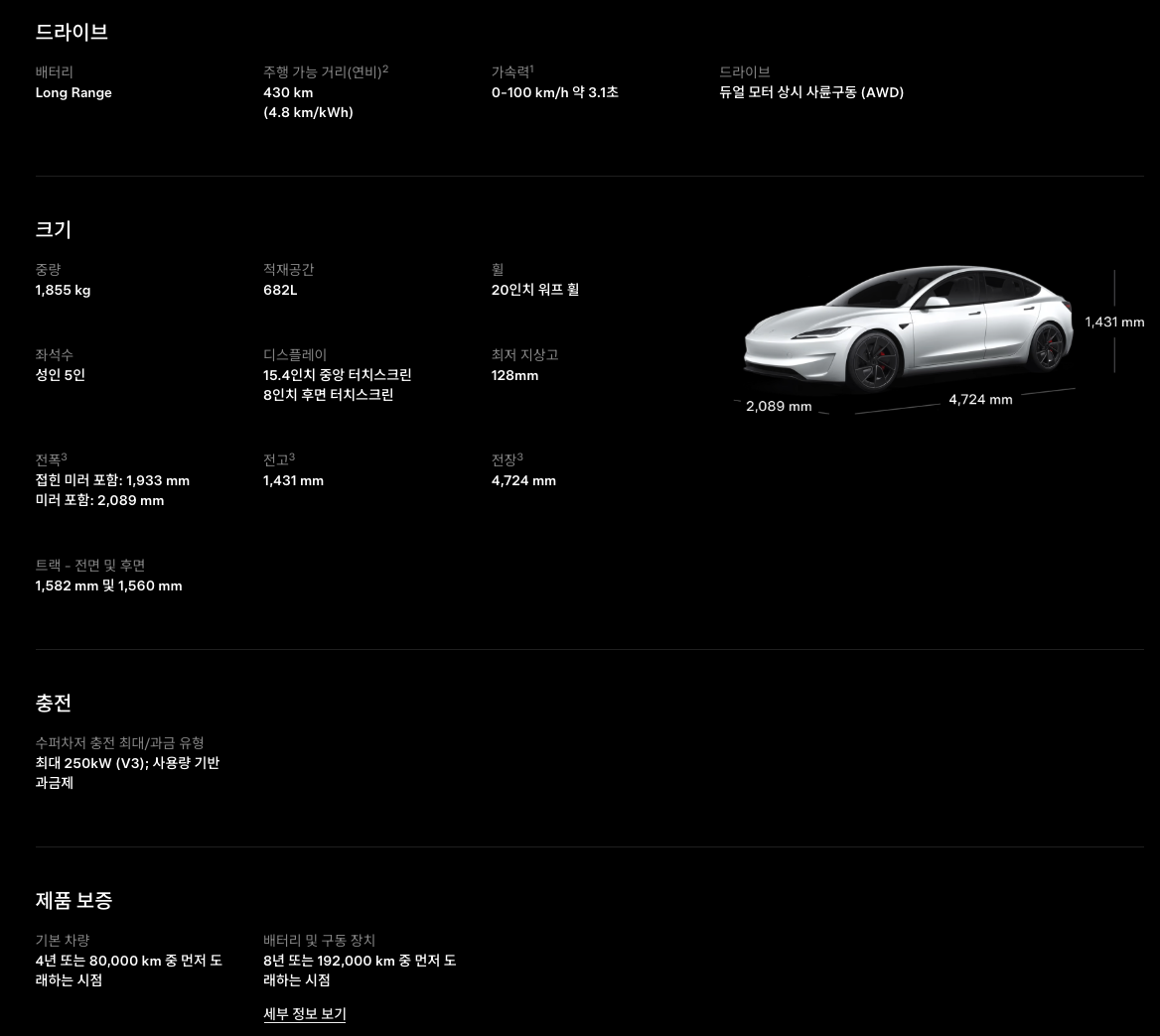 👇테슬라 모델3 Performance 제원👇